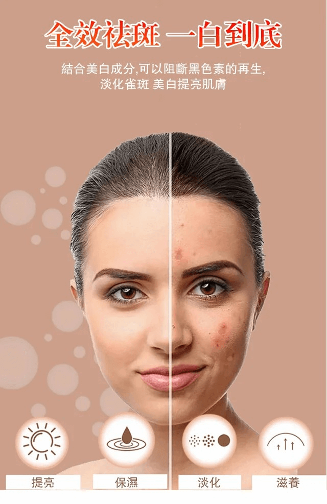 產品功效:提亮減少瑕疵,美白肌膚,幫助改善暗黃肌膚,改善色斑,補水保濕,讓肌膚勻凈,白皙,透嫩,呈現美肌光采,深層祛斑消印,淡退斑肌不反彈,美白提亮,每日一用,打造光感美肌!
