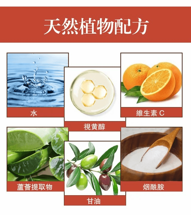 產品成分:水,視黃醇,維生素C,蘆薈提取物,甘油,煙酰胺
