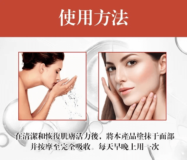 使用方法:在清潔和恢復肌膚活力後,將本品塗抹於面部並按摩至完全吸收,每天早晚用一次